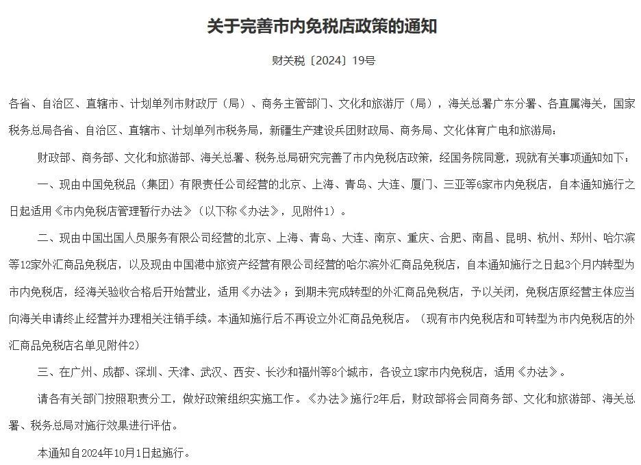 近日,财政部、商务部、文化和旅游部、海关总署、税务总局印发《关于完善市内免税店政策的通知》(下称《通知》),明确自2024年10月1日起,按照《市内免税店管理暂行办法》(下称《办法》)规范市内免税店管理工作配资炒股网站问必选,促进市内免税店健康有序发展。